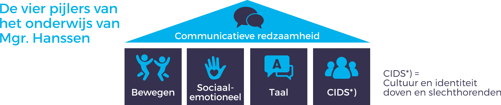 Onze visieIn de schoolvisie is onze ecologische kijk op het kind verwoord: wij kijken naar kinderen in relatie tot hun omgeving. De totale ontwikkeling van een kind staat centraal en er is bijzondere aandacht voor de communicatieve ontwikkelingsaspecten. Onder communicatie verstaan we niet alleen de mondelinge, maar ook de schriftelijke taal en de sociale competentie (de pragmatische aspecten van de communicatie). Het onderwijs en de begeleiding aan onze leerlingen, met betrekking tot de specifieke hulpvragen op auditief en/of communicatief gebied, wordt door drie pijlers (de voorwaarden voor een goede en effectieve communicatie) gedragen: